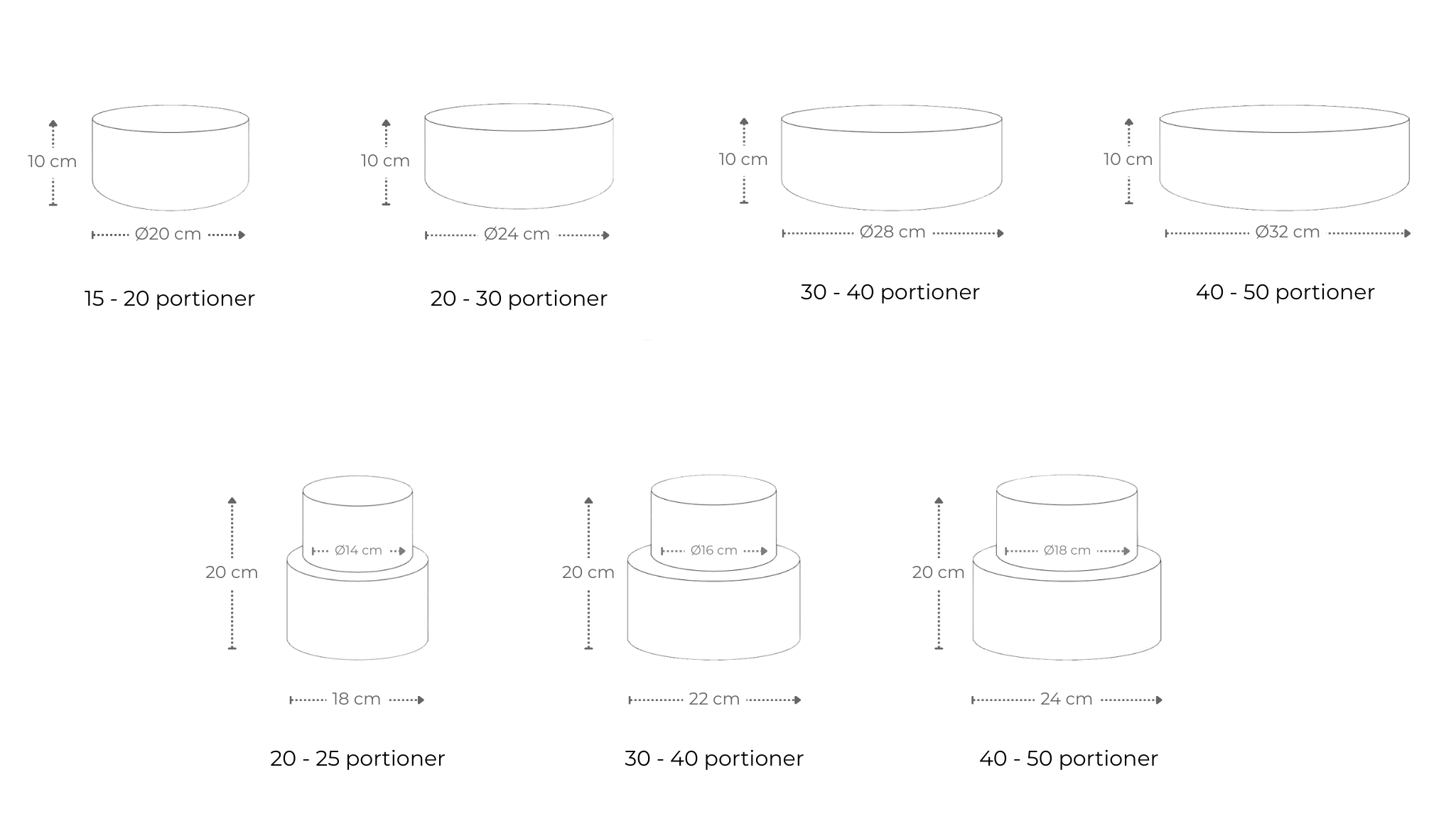 Vi tilbyder 4 kagestørrelser af vores opsmurte kager i klassisk højde, og 3 størrelser hvis I ønsker flere etager.